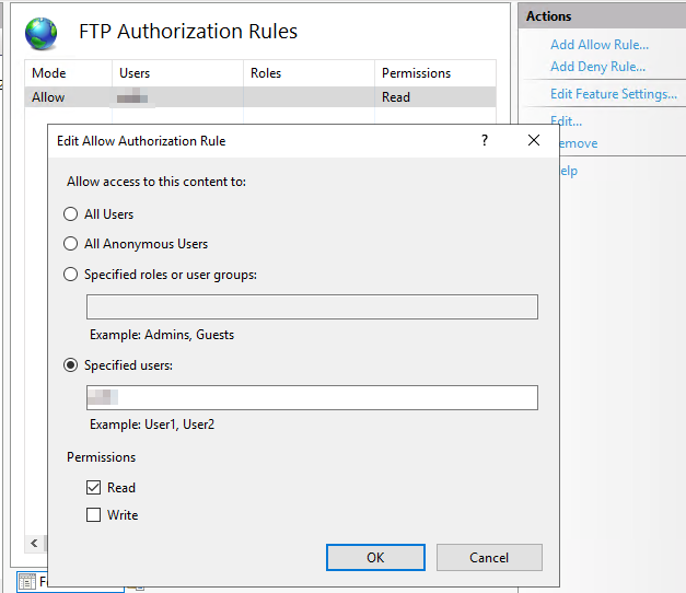 4. FTP 권한 룰에서는 접속 계정명이 설정되어 있어야 합니다.