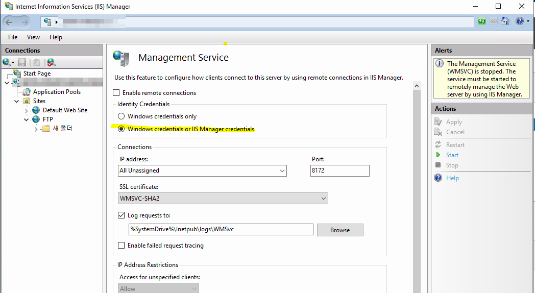 2. Management Service에서 IIS Manager credetials가 체크되어 있어야 합니다.