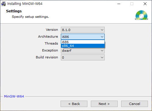 윈도우용 MinGW-W64를 설치해야하고 설치시, Architecture에서 x86_64를 선택해주어야합니다.