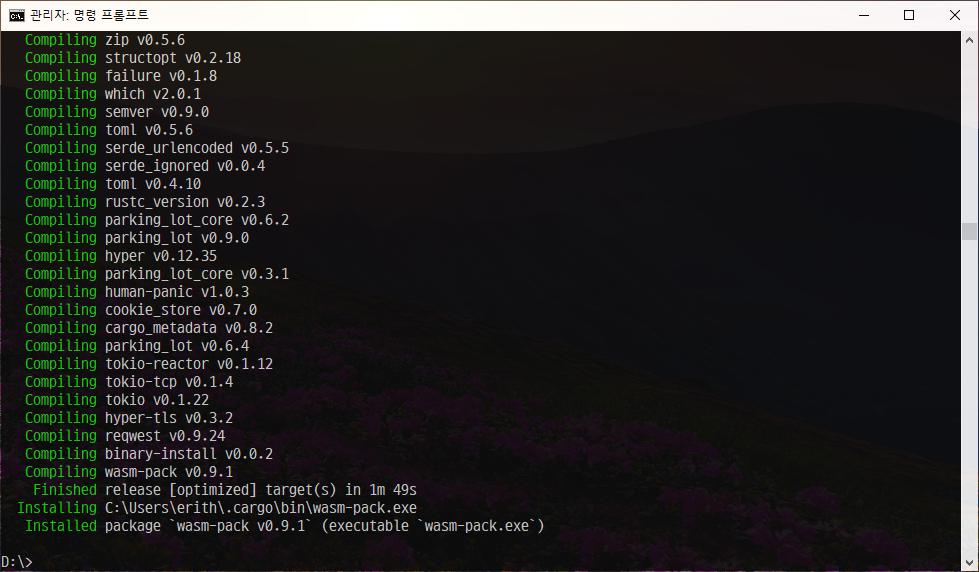 다시 cargo install wasm-pack 하면 모두 잘 인스톨 되는걸 확인할 수 있습니다.