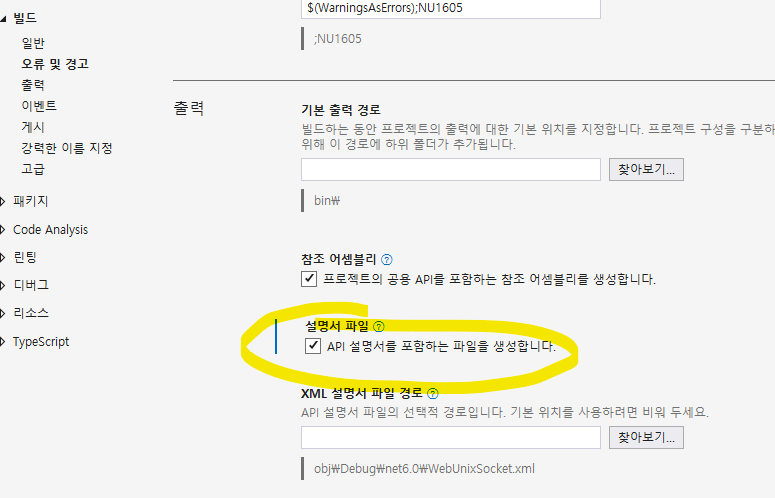 1. 프로젝스 설정 > 빌드 > 설명서 파일을 체크.