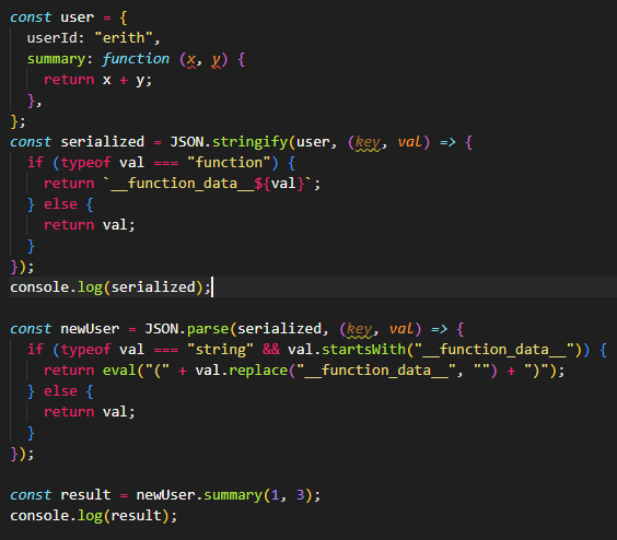 자바 스크립트에서 JSON을 직렬화할때 두번째 함수 구현 옵션을 활용하여, 함수내용 자체를 문자열로 변환해서 보낼 수 있다.