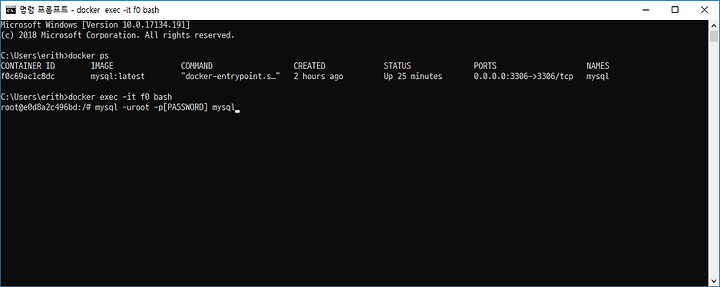 그리고 mysql -uroot -p[암호] mysql 하여 mysql로 접속합니다.