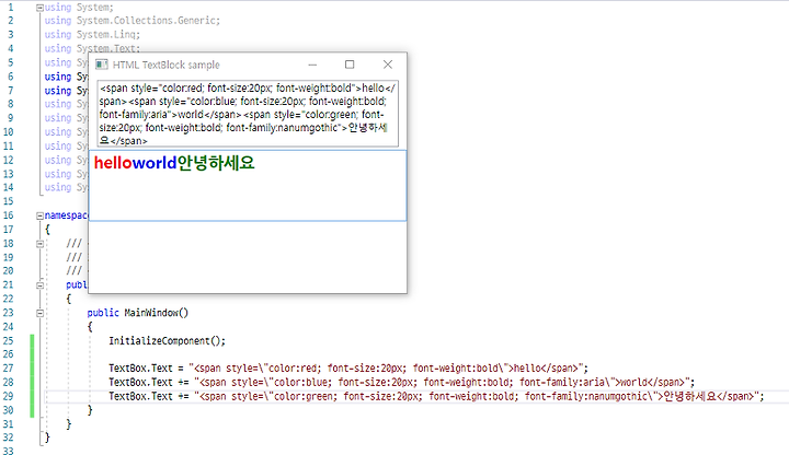 TextBox.Text += "<span style=\"color:green; font-size:20px; font-weight:bold; font-family:nanumgothic\">안녕하세요</span>";