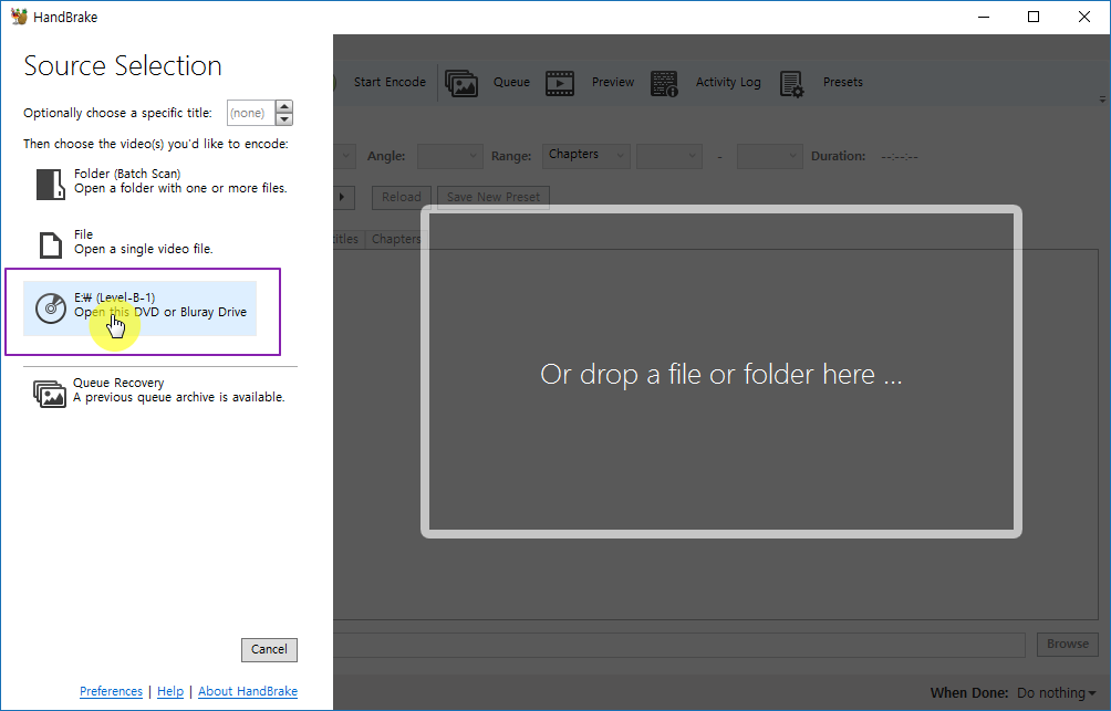 3. handbrake 프로그램을 실행하면 소스 선택 화면이 나타납니다.