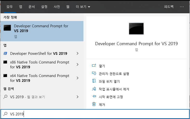 4. Visual Studio 개발자 프롬프트를 관리자 권한으로 실행하여 아래 명령어를 실행합니다.