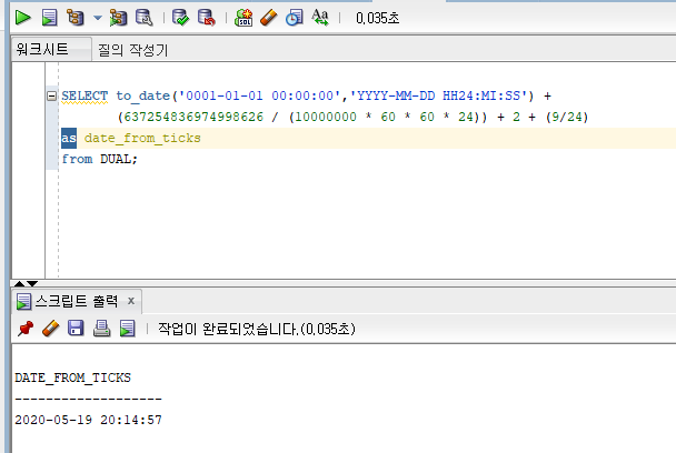 오라클에서 Tick값을 그대로 계산해서 보면 2일이 모자라게 나타납니다.