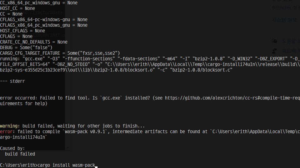 rust 및 cargo 설치 후, cargo install wasm-pack 으로 wasm 개발팩을 설치하게 되는데 GCC관련 오류가 납니다.
